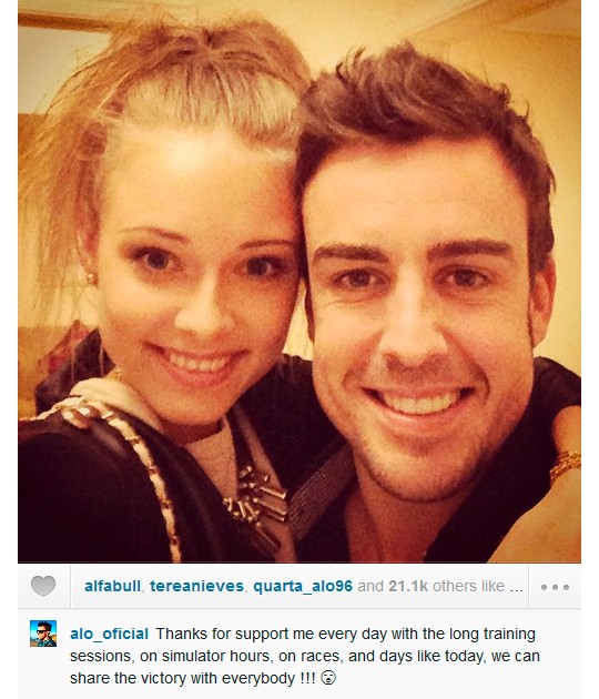 Este domingo Fernando Alonso se hizo con el Gran Premio de España de Fórmula 1, y a pesar de que empezó quinto, logró avanzar y llegar a la meta. El piloto quiso compartir con todos sus seguidores su alegría por la victoria y lo bien que se siente junto a su novia Dasha Kapustina, por eso colgó esta foto en su perfil de Instagram, en la que celebra la victoria con su novia, y además, le dedicó este bonito mensaje: "Gracias por apoyarme cada día con las largas sesiones de entrenamiento, en las horas de simulación, en las carreras, y en días como hoy, podemos compartir la victoria con todo el mundo!!!" ¡Qué buena pareja hacen! ¡Enhorabuena Alonso!